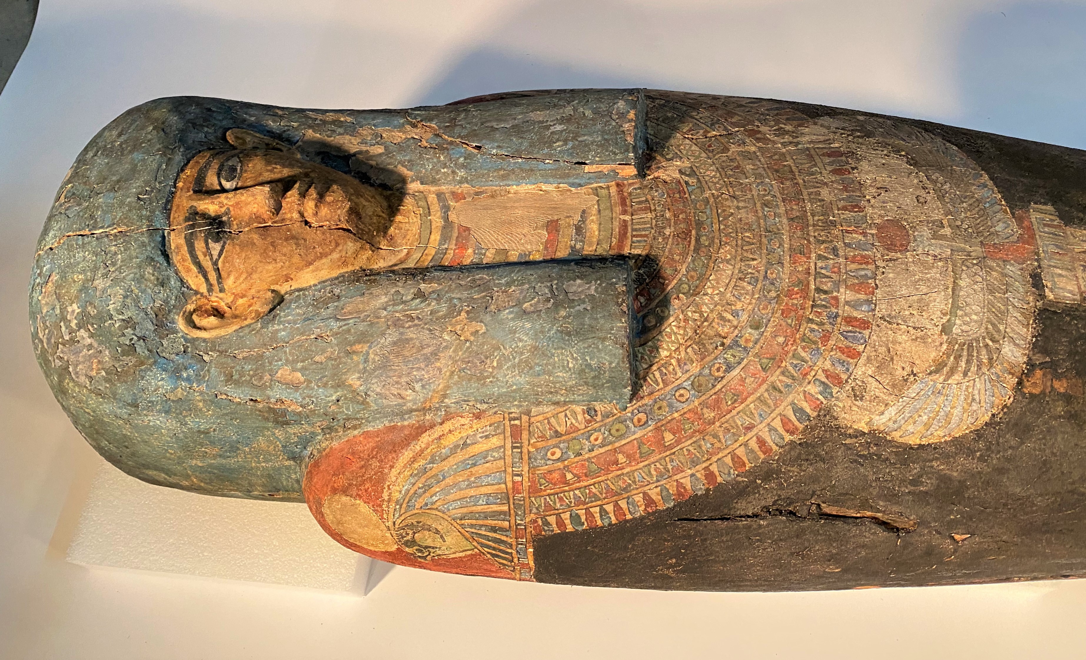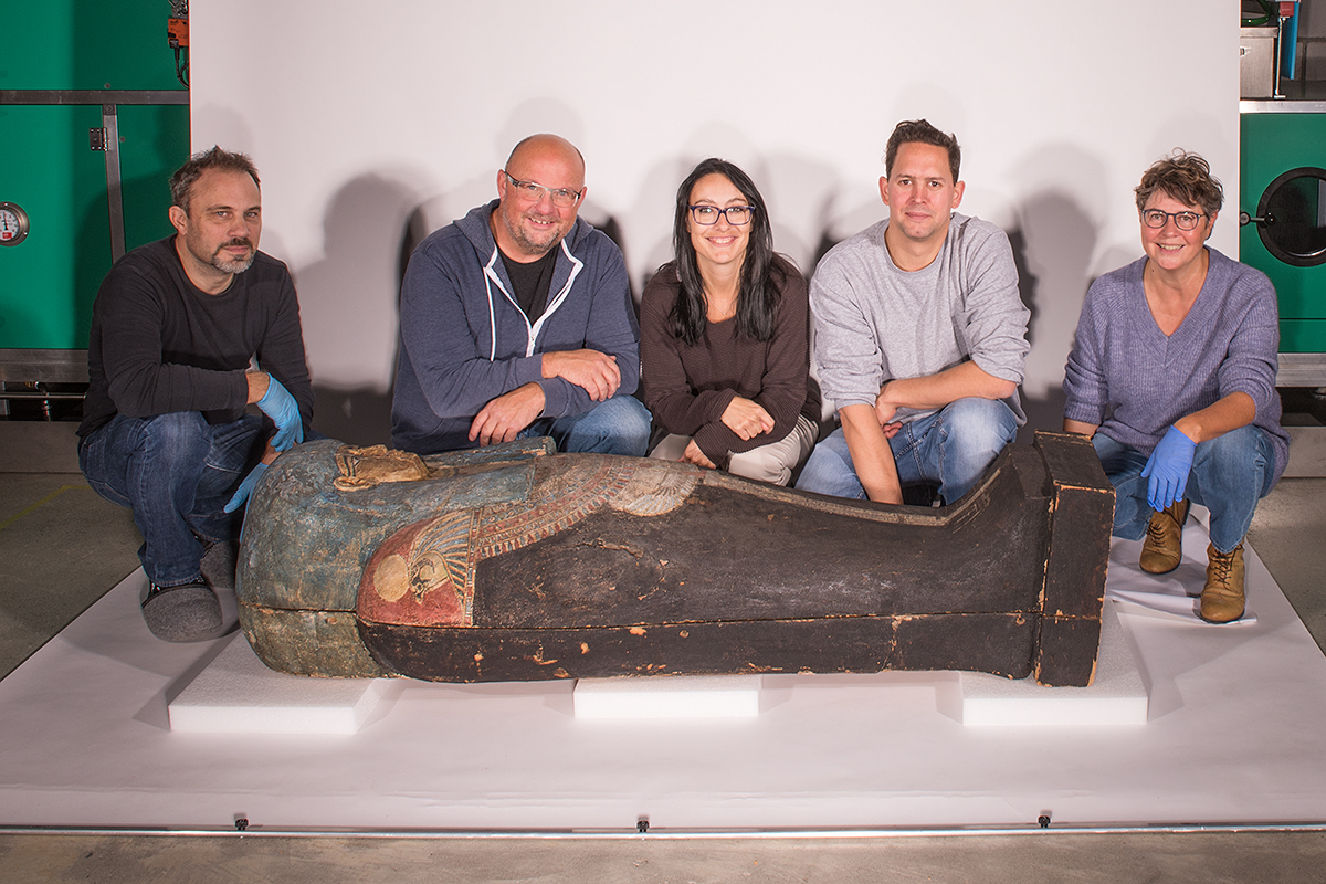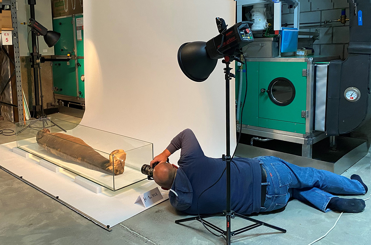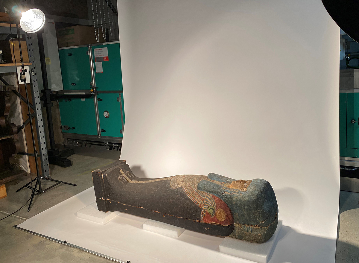 Einen Schwerpunkt der Fotosession bildeten Sarg, Mumie und Kartonage-Abdeckungen der Scherit-Min. Sie waren zwar alle schon in unserer Publikation „Unter dem Schutz der Himmelsgöttin“ von 2007 abgebildet. Unmittelbar nach Erscheinen des Buches wurden Sarg und Kartonagen jedoch gereinigt und sanft restauriert. Jetzt konnte die Sargausstattung erstmals in restauriertem Zustand fotografiert und damit ihre ursprüngliche Farbenpracht dokumentiert werden.